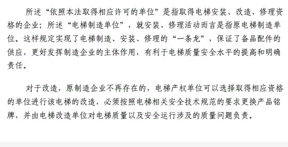 總局回復:《特種設備安全法》第二十二條已明確,電梯的安裝、改造、修理,必須由電梯制造單位或者其委托的依照本法取得相應許可的單位進行。修理包括重大修理和一般修理。