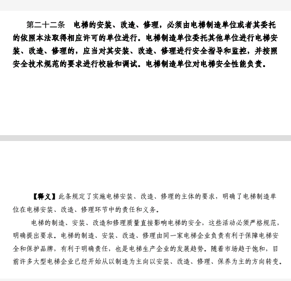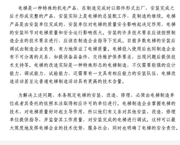 總局回復:參考《特種設備安全法釋義》中關(guān)于第二十二條的相關(guān)釋義。 問:電梯安全條例 請問,總局是否有制定電梯安全條例的計劃?如果有,目前進展如何?