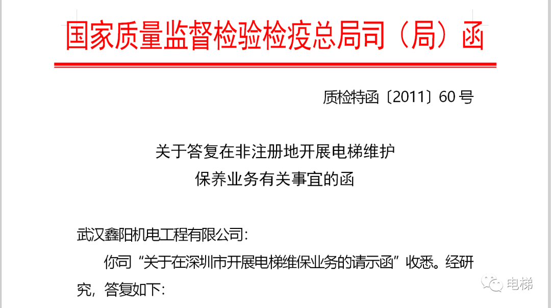 總局回復(fù):原質(zhì)檢總局特種設(shè)備局《關(guān)于答復(fù)在非注冊(cè)地開展電梯維護(hù)保養(yǎng)業(yè)務(wù)有關(guān)事宜的函》(質(zhì)檢特函〔2011〕60號(hào))已明確相關(guān)要求。
