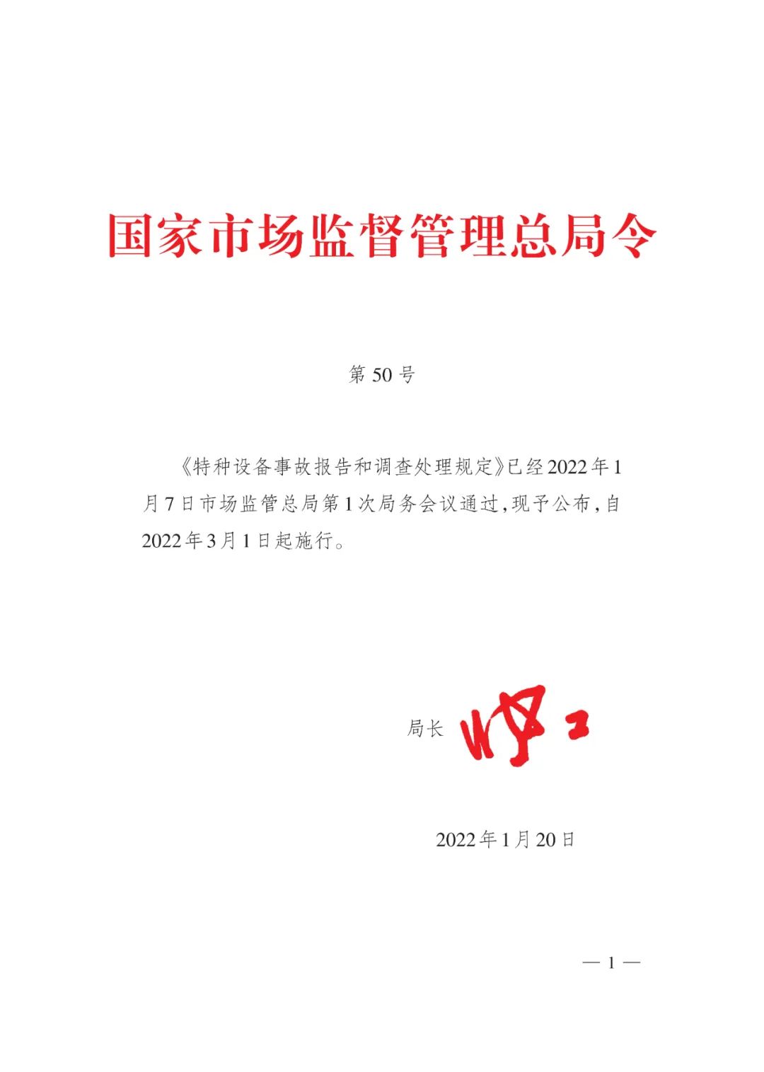 《特種設(shè)備事故報(bào)告和調(diào)查處理規(guī)定》已經(jīng)2022年1月7日市場(chǎng)監(jiān)管總局第1次局務(wù)會(huì)議通過(guò),現(xiàn)予公布,自2022年3月1日起施行。