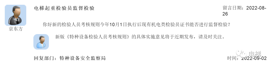 04 問(wèn):電梯起重檢驗(yàn)員監(jiān)督檢驗(yàn) 你好新的檢驗(yàn)人員考核規(guī)則今年10月1日?qǐng)?zhí)行后現(xiàn)有機(jī)電類檢驗(yàn)員證書能否進(jìn)行監(jiān)督檢驗(yàn)? 總局回復(fù):新版《特種設(shè)備檢驗(yàn)人員考核規(guī)則》的具體實(shí)施意見(jiàn)將于近期發(fā)布,請(qǐng)及時(shí)關(guān)注。