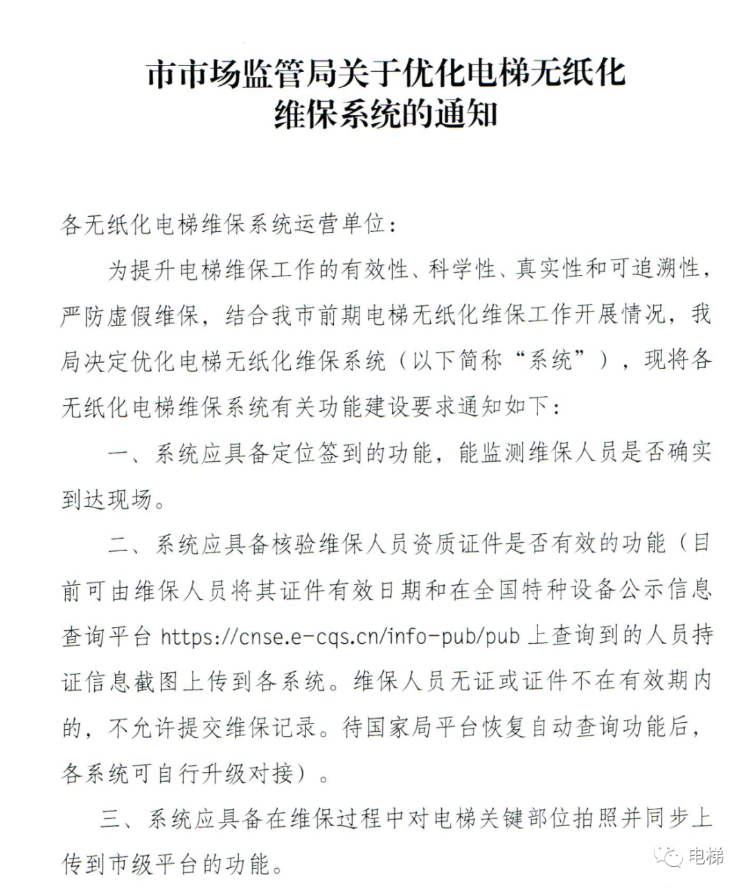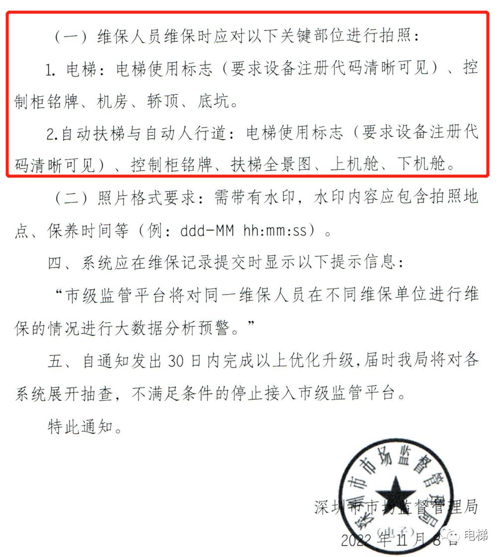 各維保單位:對(duì)電梯無紙化維保工作,市局已提出新的功能要求:簽到、核驗(yàn)作業(yè)人員資質(zhì)證件、維保過程拍照并上傳、系統(tǒng)提示功能。請(qǐng)各單位按要求落實(shí),并與系統(tǒng)開發(fā)公司聯(lián)系,將通知一并轉(zhuǎn)發(fā)給系統(tǒng)開發(fā)公司。對(duì)于未按要求落實(shí)的單位,市局將停止接入監(jiān)管平臺(tái)。具體通知如下。