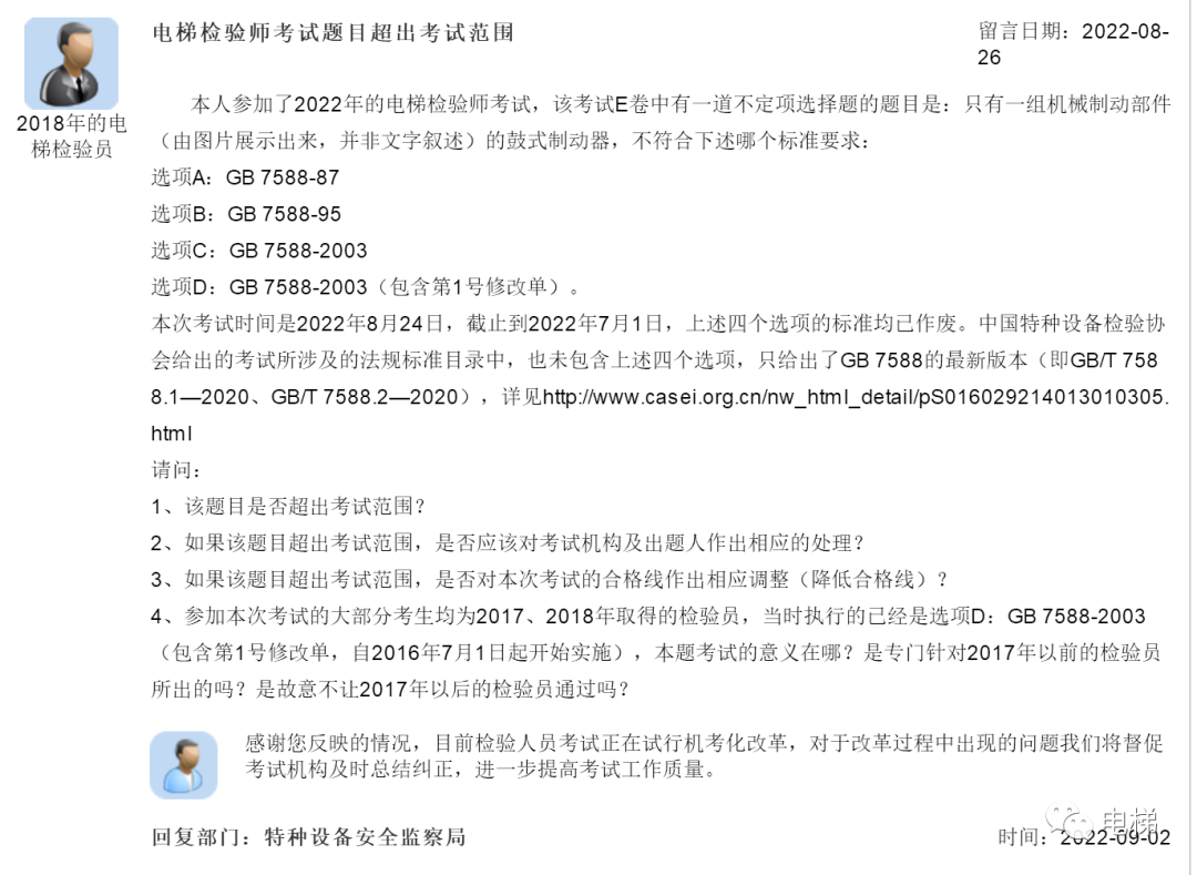 總局回復(fù):電梯檢驗(yàn)師取證考試問題;檢驗(yàn)師考試題目是否超出