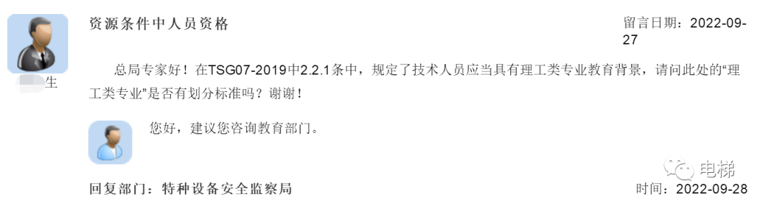 問:資源條件中人員資格 總局專家好!在TSG07-2019中2.2.1條中,規(guī)定了技術(shù)人員應(yīng)當(dāng)具有理工類專業(yè)教育背景,請(qǐng)問此處的“理工類專業(yè)”是否有劃分標(biāo)準(zhǔn)嗎?謝謝! 總局回復(fù):您好,建議您咨詢教育部門。