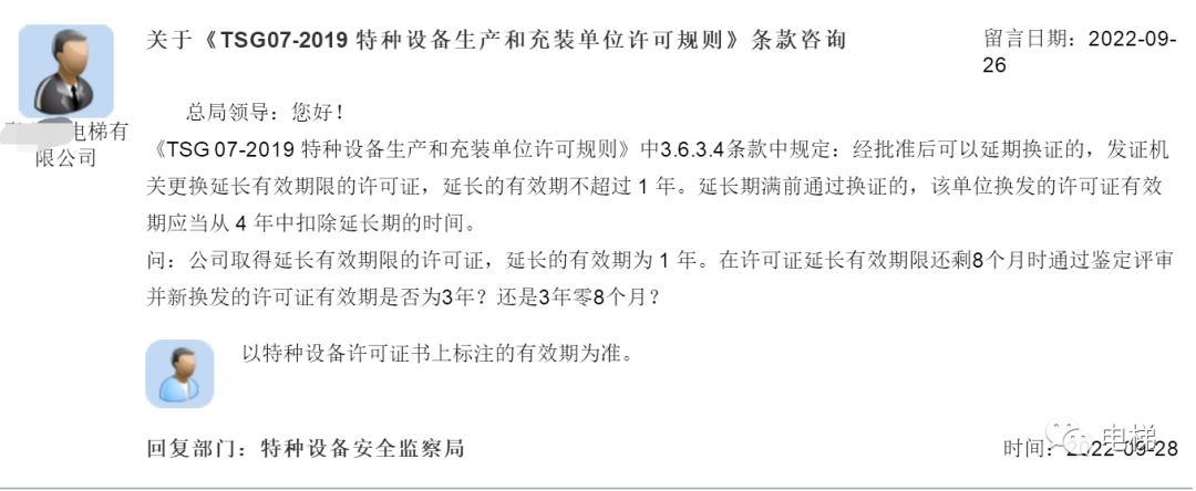 問:關(guān)于《TSG07-2019 特種設(shè)備生產(chǎn)和充裝單位許可規(guī)則》條款咨詢 總局領(lǐng)導(dǎo):您好! 總局回復(fù):以特種設(shè)備許可證書上標(biāo)注的有效期為準(zhǔn)。