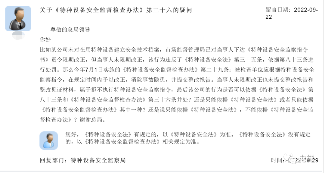 問:關(guān)于《特種設(shè)備安全監(jiān)督檢查辦法》第三十六的疑問 尊敬的總局領(lǐng)導(dǎo) 你好 比如某公司未對(duì)在用特種設(shè)備建立安全技術(shù)檔案,市場(chǎng)監(jiān)督管理局已對(duì)當(dāng)事人下達(dá)《特種設(shè)備安全監(jiān)察指令書》責(zé)令限期改正,但當(dāng)事人未限期改正,該行為違反了《特種設(shè)備安全法》第三十五條,依據(jù)第八十三條進(jìn)行處罰。那么今年7月1日實(shí)施的《特種設(shè)備安全監(jiān)督檢查辦法》第二十九條:被檢查單位應(yīng)根據(jù)特種設(shè)備安全監(jiān)察指令,在規(guī)定時(shí)間內(nèi)予以改正,消除事故隱患,并提交整改報(bào)告。當(dāng)事人未限期改正也未提交整改報(bào)告和整改見證材料,屬于拒不執(zhí)行特種設(shè)備安全監(jiān)察指令,最后該公司的行為是否可以依據(jù)《特種設(shè)備安全法》第八十三條和《特種設(shè)備安全監(jiān)督檢查辦法》第三十六條并處?還是只能依據(jù)《特種設(shè)備安全法》或者只能依據(jù)《特種設(shè)備安全監(jiān)督檢查辦法》其中一種?還是說只能依據(jù)《特種設(shè)備安全法》,不能依據(jù)《特種設(shè)備安全監(jiān)督檢查辦法》?謝謝總局。 總局回復(fù):您好,《特種設(shè)備安全法》有規(guī)定的,以《特種設(shè)備安全法》為準(zhǔn)。《特種設(shè)備安全法》沒有規(guī)定的,以《特種設(shè)備安全監(jiān)督檢查辦法》相關(guān)規(guī)定為準(zhǔn)。