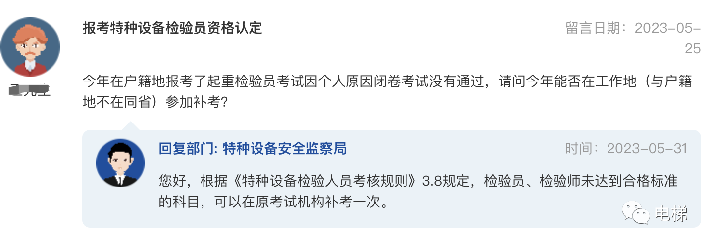 ps:這條也適用與我們電梯檢驗(yàn)員和檢驗(yàn)師考試,補(bǔ)考要在原考試機(jī)構(gòu)補(bǔ)考。