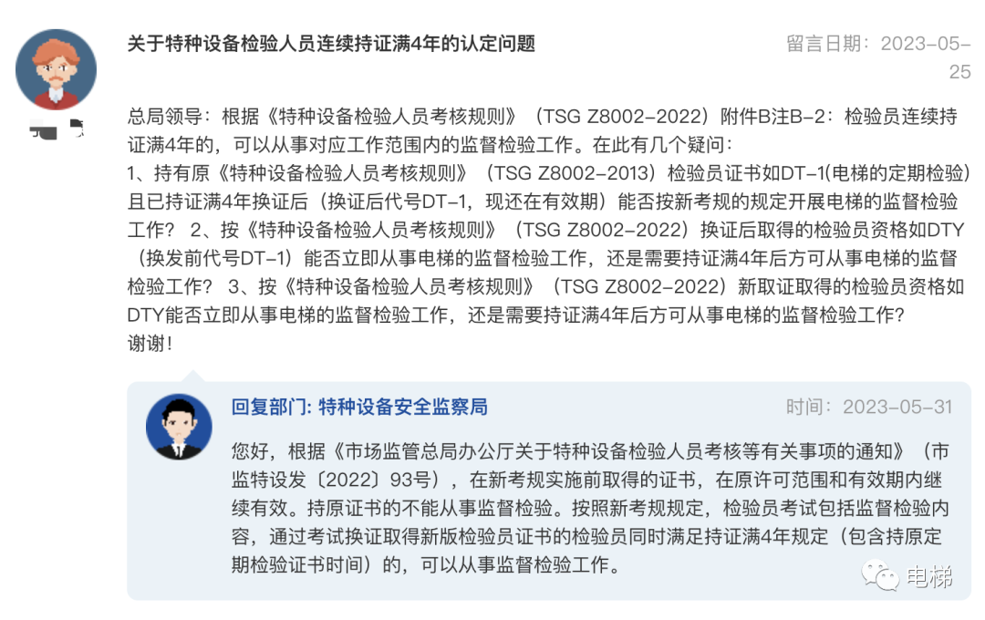 總局領(lǐng)導(dǎo):根據(jù)《特種設(shè)備檢驗(yàn)人員考核規(guī)則》(TSG Z8002-2022)附件B注B-2:檢驗(yàn)員連續(xù)持證滿4年的,可以從事對(duì)應(yīng)工作范圍內(nèi)的監(jiān)督檢驗(yàn)工作。在此有幾個(gè)疑問(wèn):