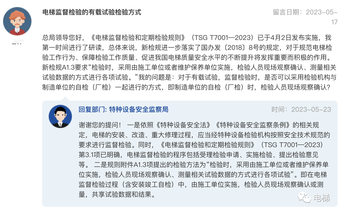 總局回復(fù):謝謝您的提問(wèn)!一是依照《特種設(shè)備安全法》《特種設(shè)備安全監(jiān)察條例》的相關(guān)規(guī)定,電梯的安裝、改造、重大修理過(guò)程,應(yīng)當(dāng)經(jīng)特種設(shè)備檢驗(yàn)機(jī)構(gòu)按照安全技術(shù)規(guī)范的要求進(jìn)行監(jiān)督檢驗(yàn)。同時(shí),《電梯監(jiān)督檢驗(yàn)和定期檢驗(yàn)規(guī)則》(TSG T7001—2023)第3.1項(xiàng)已明確,電梯監(jiān)督檢驗(yàn)的程序包括受理檢驗(yàn)申請(qǐng)、實(shí)施檢驗(yàn)、提出檢驗(yàn)意見(jiàn)等。二是規(guī)則附件A1.3項(xiàng)提出的檢驗(yàn)方法為“檢驗(yàn)時(shí),采用由施工單位或者維護(hù)保養(yǎng)單位實(shí)施,檢驗(yàn)人員現(xiàn)場(chǎng)觀察確認(rèn)、測(cè)量相關(guān)試驗(yàn)數(shù)據(jù)的方式進(jìn)行各項(xiàng)試驗(yàn)”。即在電梯監(jiān)督檢驗(yàn)過(guò)程(含安裝竣工自檢)中,由施工單位實(shí)施,檢驗(yàn)人員現(xiàn)場(chǎng)觀察確認(rèn)或測(cè)量,共享試驗(yàn)數(shù)據(jù)和結(jié)果。