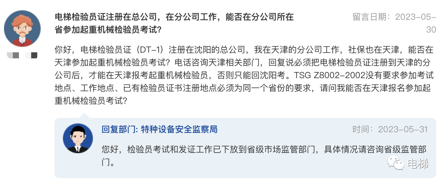 問(wèn):電梯檢驗(yàn)員證注冊(cè)在總公司,在分公司工作,能否在分公司所在省參加起重機(jī)械檢驗(yàn)員考試?