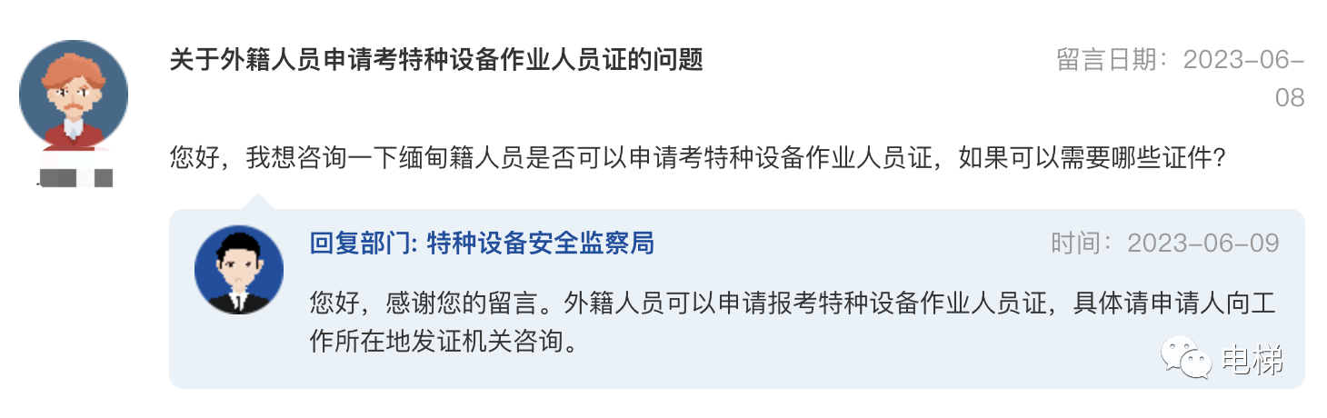 總局回復(fù):您好,感謝您的留言。外籍人員可以申請(qǐng)報(bào)考特種設(shè)備作業(yè)人員證,具體請(qǐng)申請(qǐng)人向工作所在地發(fā)證機(jī)關(guān)咨詢。