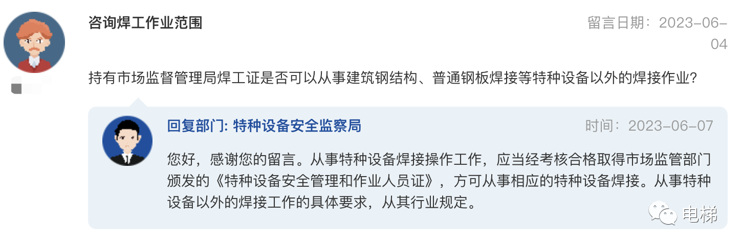 總局回復(fù):您好,感謝您的留言。從事特種設(shè)備焊接操作工作,應(yīng)當(dāng)經(jīng)考核合格取得市場(chǎng)監(jiān)管部門頒發(fā)的《特種設(shè)備安全管理和作業(yè)人員證》,方可從事相應(yīng)的特種設(shè)備焊接。從事特種設(shè)備以外的焊接工作的具體要求,從其行業(yè)規(guī)定。