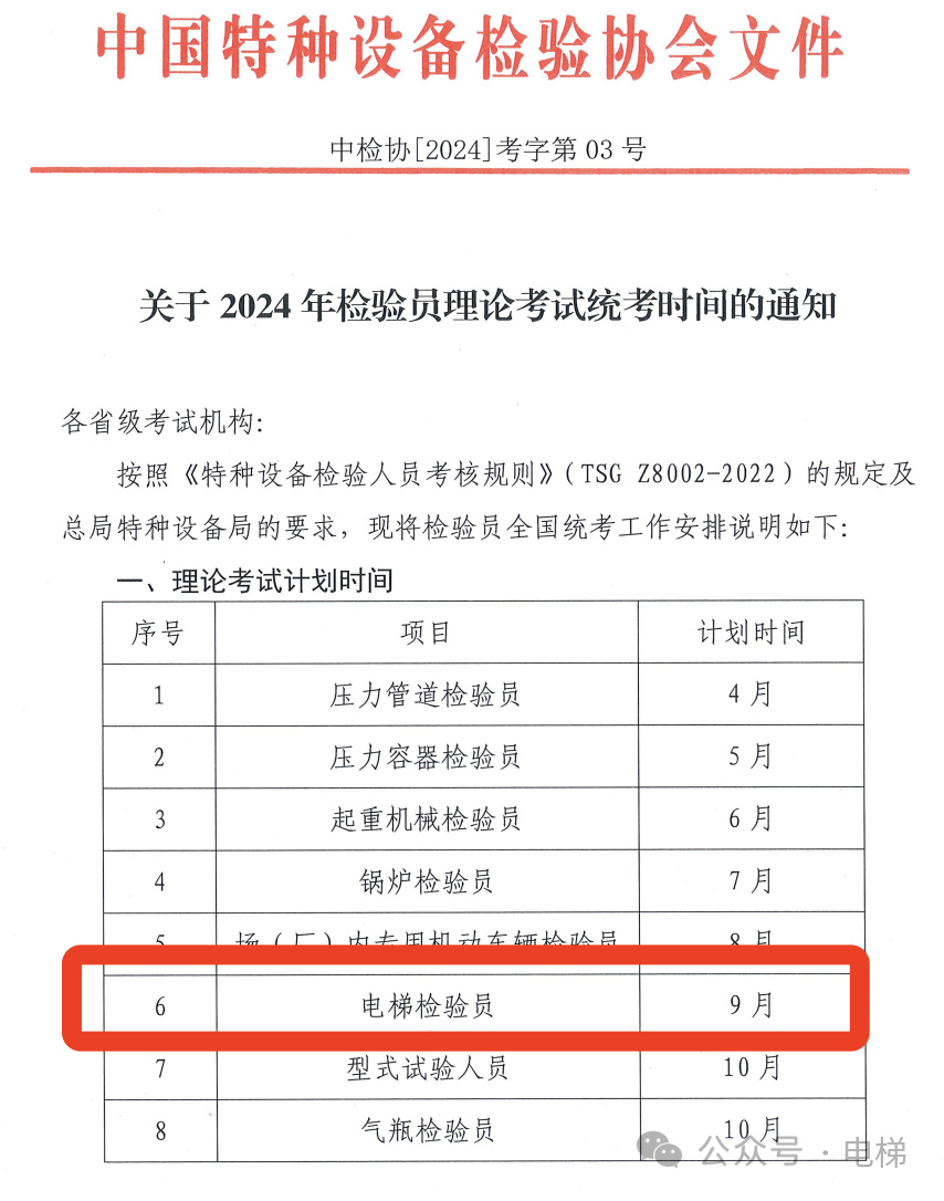 2024年1月10日中國特種設(shè)備檢驗(yàn)協(xié)會(huì)發(fā)布了今年電梯檢驗(yàn)員統(tǒng)考計(jì)劃,全國電梯檢驗(yàn)員理論統(tǒng)一考試的時(shí)間安排在9月份。