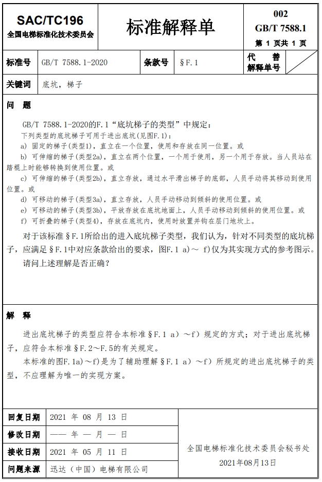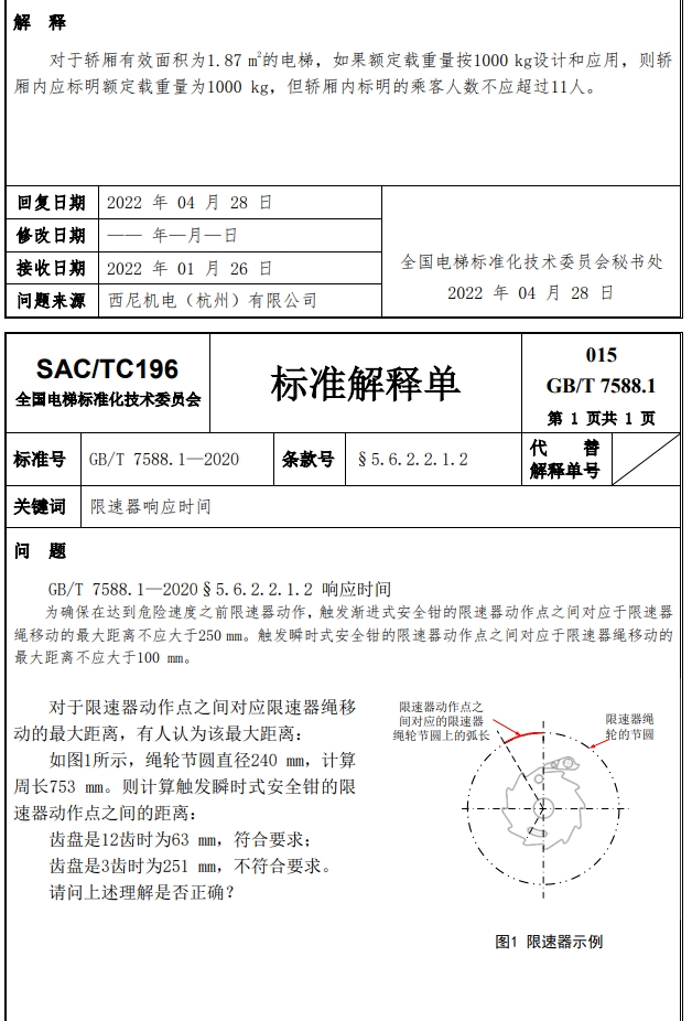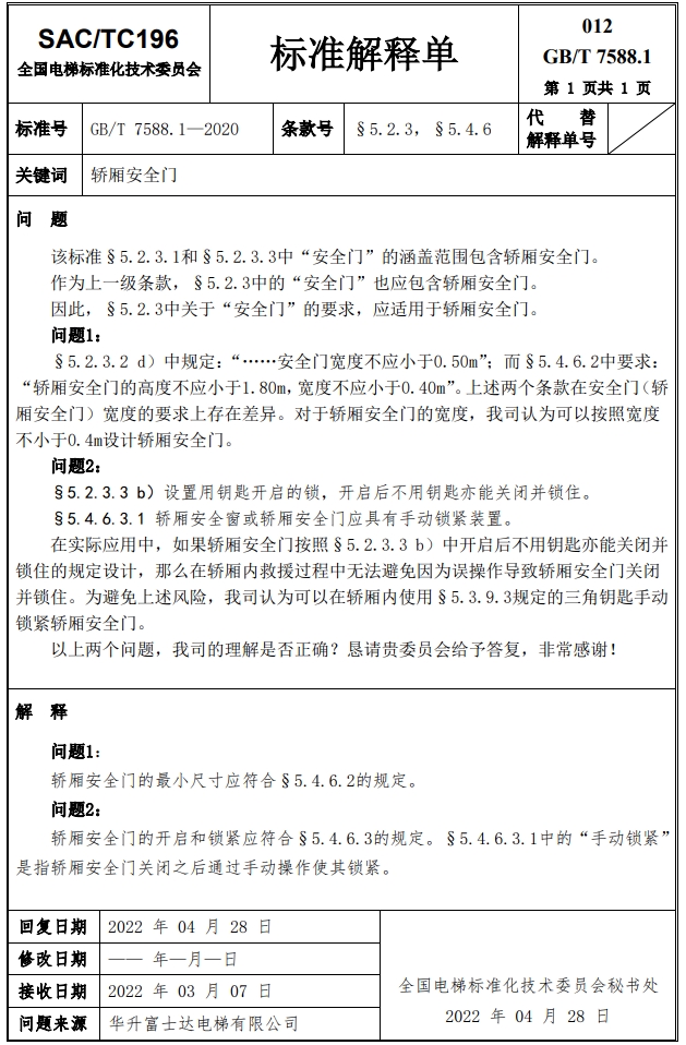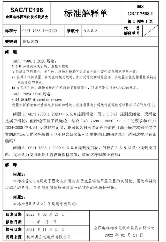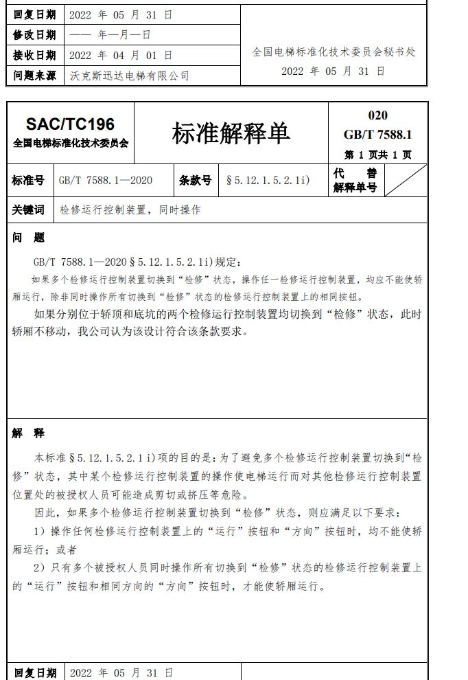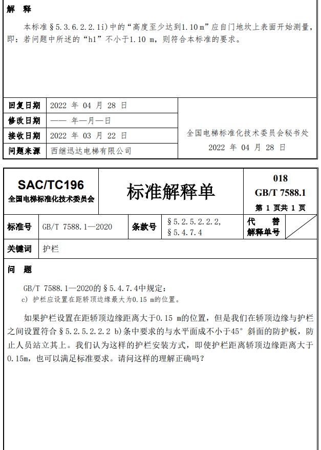 關(guān)于發(fā)布GB/T 7588.1—2020《電梯制造與安裝安全規(guī)范 第1部分:乘客電梯和載貨電梯》第23號(hào)解釋單的通知 全國(guó)電梯標(biāo)準(zhǔn)化技術(shù)委員會(huì)發(fā)布了GB/T 7588.1—2020《電梯制造與安裝安全規(guī)范 第1部分:乘客電梯和載貨電梯》第23號(hào)標(biāo)準(zhǔn)解釋單(在全國(guó)電梯標(biāo)準(zhǔn)化技術(shù)委員會(huì)官方網(wǎng)站“標(biāo)準(zhǔn)解釋單”欄目中可下載)。 2024年3月27日